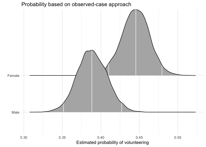 We first calculate the average “effect” of sex on volunteering, again generating a full posterior distribution. Again, xcol represents the position of the covariate of interest, and xrange specifies the values for which Pr(y = 1) is to be calculated.
