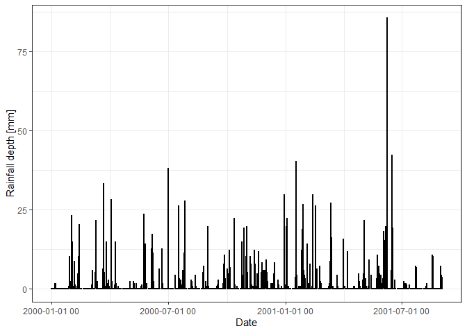 The drawre function returns a list with a dataframe, named Rainfall_Characteristics, and a sublist, named Rainfall_Events. Rainfall_Characteristics contains the main information of each extracted rainfall event such as the number of event, the beginning and end of the event, duration, volume, and average intensity. Rainfall_Events contains several dataframes with the values of rainfall pulses of each extracted rainfall event. The first dataframe in Rainfall_Events corresponds to the first event in Rainfall_Characteristics, the second dataframe in Rainfall_Events corresponds to the second event in Rainfall_Characteristics and so on.