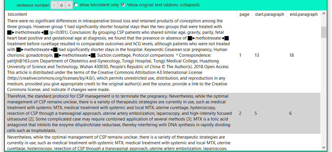 1. Show original text (abbreviations collapsed): Choosing this setting will restore the orginial sentences by replacing ABBREVIATION (search word)$* with ABBREVIATION, e.g., MTX (Methotrexate)$* with MTX.