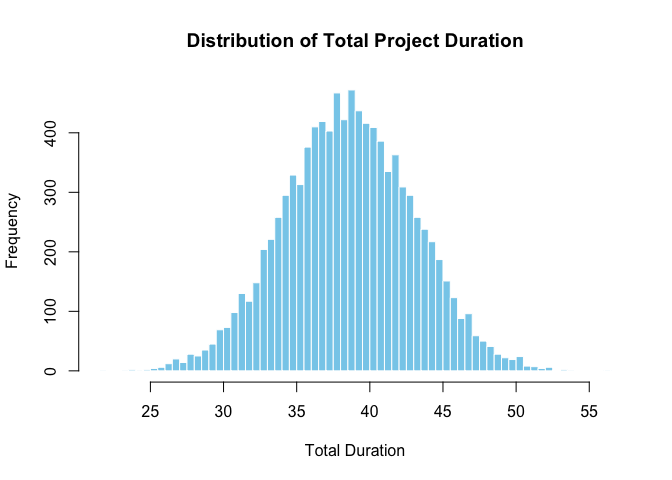 hist(results$total_distribution, breaks = 50, main = "Distribution of Total Project Duration",