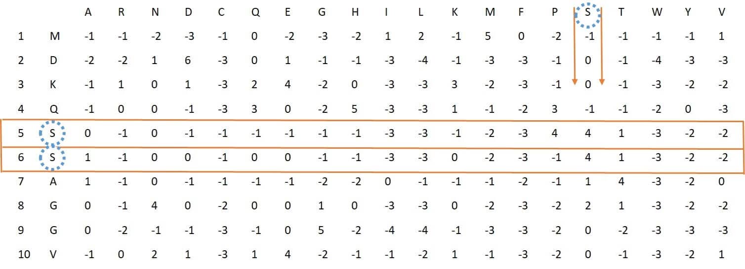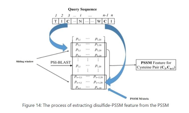 This feature vector is of length 8000, which is extracted from the PSSM. If we multiply elements available in three consecutive rows and three different columns of the PSSM by each other, and apply this to all rows (all three consecutive rows) and then sum these numbers, eventually one of the elements of feature vector with length 8000 corresponding to the three selected columns will be obtained. Because we have 20 different columns, The final feature vector will be of length 8000 = 20 * 20 * 20. Figure 4: shows these steps. For example, in this figure for three marked rows and columns, the numbers obtained from the intersection of these rows and columns marked with a blue dotted circle around them, are multiplied to each other.