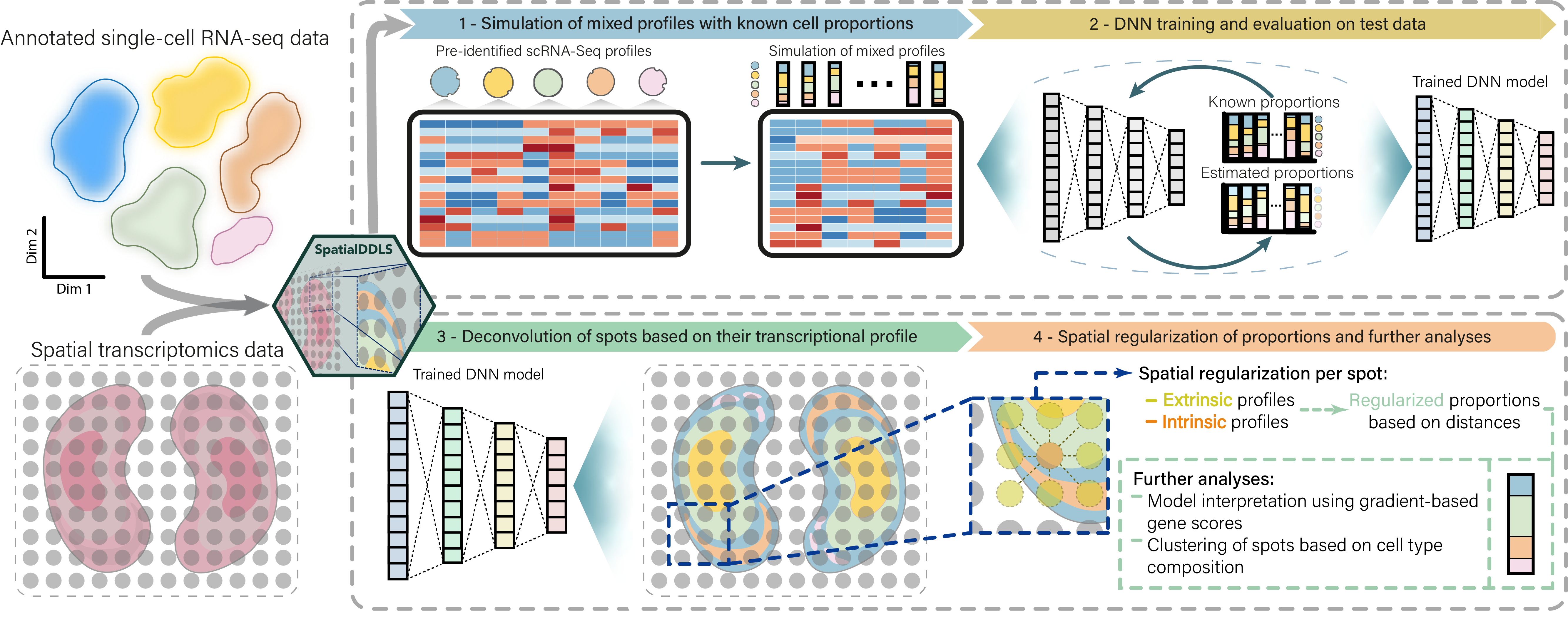 The SpatialDDLS R package provides a neural network-based solution for cell type deconvolution of spatial transcriptomics data. The package takes advantage of single-cell RNA sequencing (scRNA-seq) data to simulate mixed transcriptional profiles with known cell composition and train fully-connected neural networks to predict cell type composition of spatial transcriptomics spots. The resulting trained models can be applied to new spatial transcriptomics data to predict cell type proportions, allowing for a more accurate cell type identification and characterization of spatially-resolved transcriptomic data. Overall, SpatialDDLS is a powerful tool for cell type deconvolution in spatial transcriptomics data, providing a reliable, fast and flexible solution for researchers in the field.