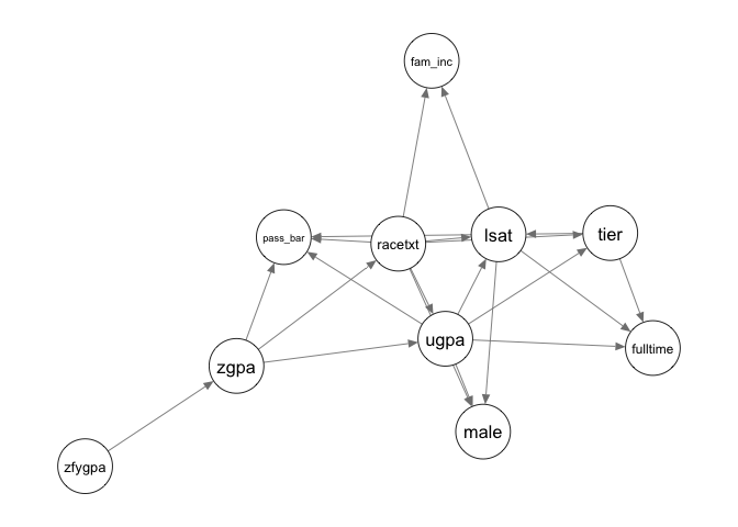 We will use the lawschool Bayesian network as an example. To load it in the environment simply call data(lawschool) and to then plot it (for instance using graphviz.plot from the bnlearn package)