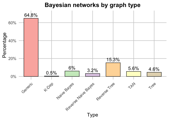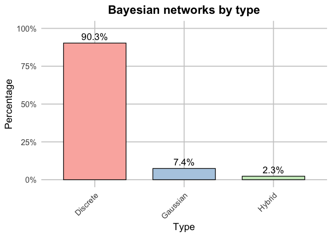 bnRep includes over 200 Bayesian networks from more than 150 academic publications. It includes discrete, Gaussian and conditional linear Gaussian Bayesian networks, all stored as appropriate bn.fit objects from bnlearn. They can be exported for use to other software (e.g. Phython libraries) using functions from bnlearn such as write.bif(). Recall that in order to plot the associated DAG, one must first convert it to a graph object with bn.net() from the bnlearn package.