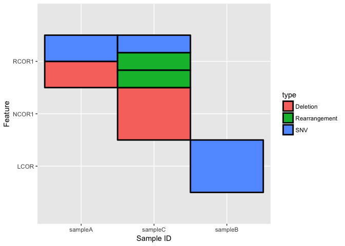 For instance in the field of cancer genomics, we are often interested in knowing how different mutations (type) in different samples (sampleID) correlate between genes (feature). The input data.frame would have this format: