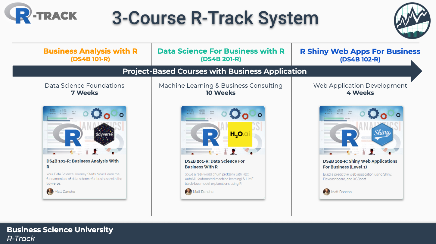Business Science teaches students how to apply data science for business. The entire curriculum is crafted around business consulting with data science. Correlation Analysis is one of the many techniques that we teach in our curriculum. Learn from our data science application experience with real-world business projects.