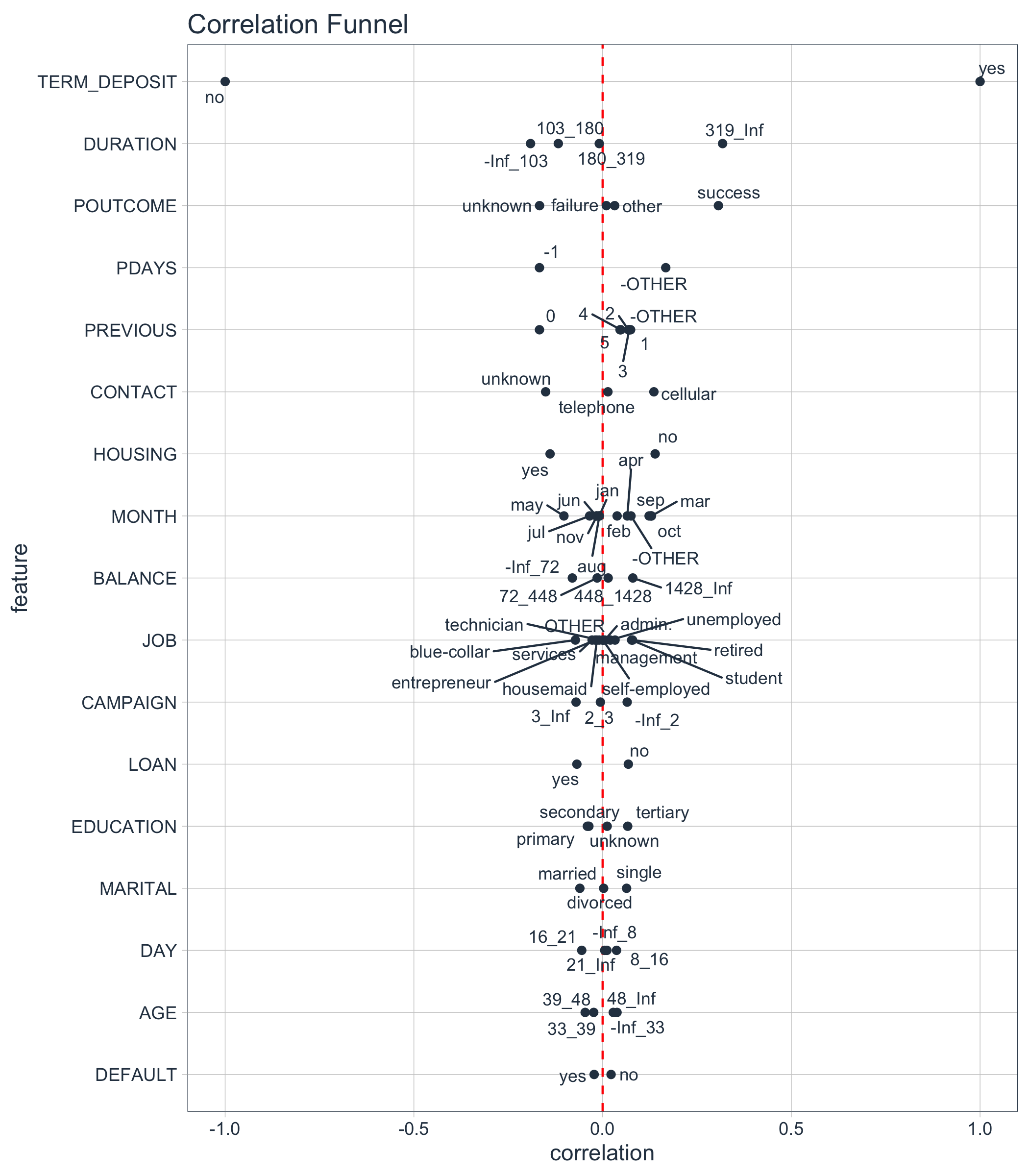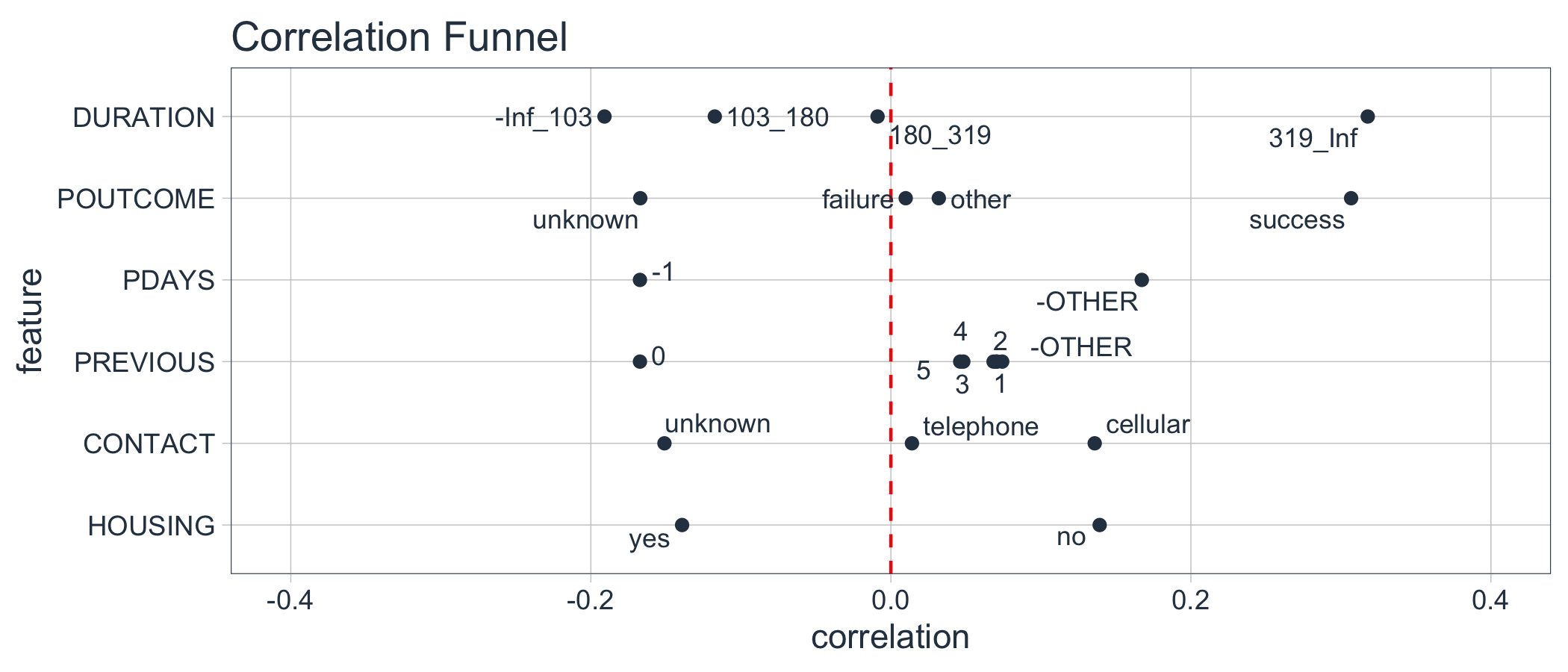 Solution: Enter correlationfunnel. The package provides a succinct workflow and interactive visualization tools for understanding which features have relationships to target (response).