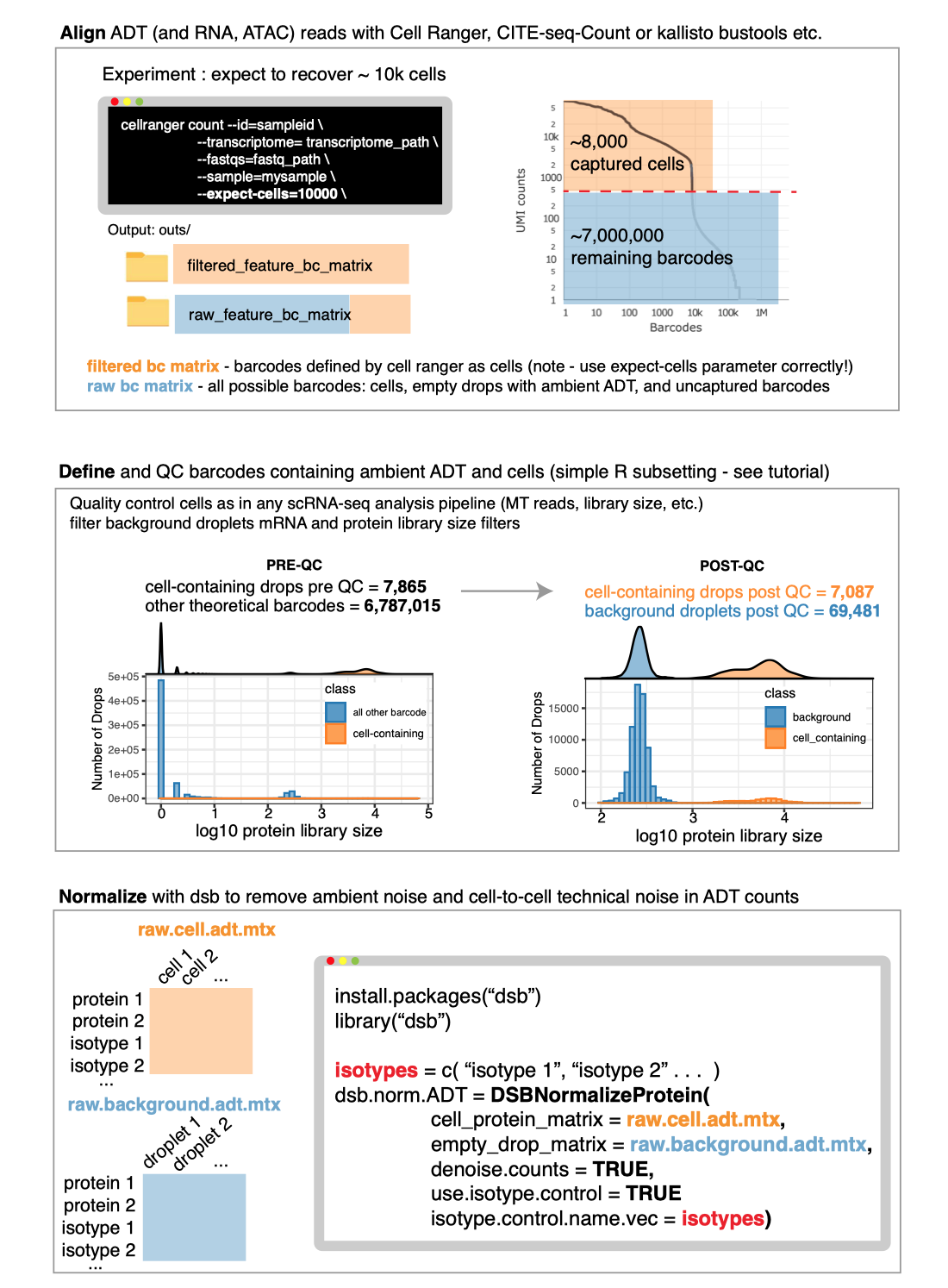 Our paper combined experiments and computational approaches to find ADT protein data from CITE-seq and related assays are affected by substantial background noise. We observed that ADT reads from empty droplets—often more than tenfold the number of cell-containing droplets—closely match levels in unstained spike-in cells, and can also serve as a readout of protein-specific ambient noise. We also remove cell-to-cell technical variation by estimating a conservative adjustment factor derived from isotype control levels and per cell background derived from a per cell mixture model. The 2.0 release of dsb includes faster compute times and functions for normalization on datasets without empty drops.