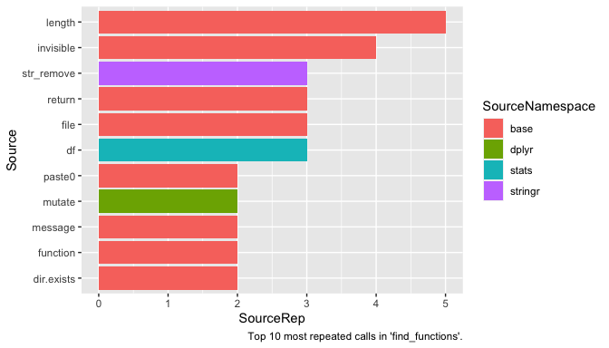 labs(caption = "Top 10 most repeated calls in 'find_functions'.")
