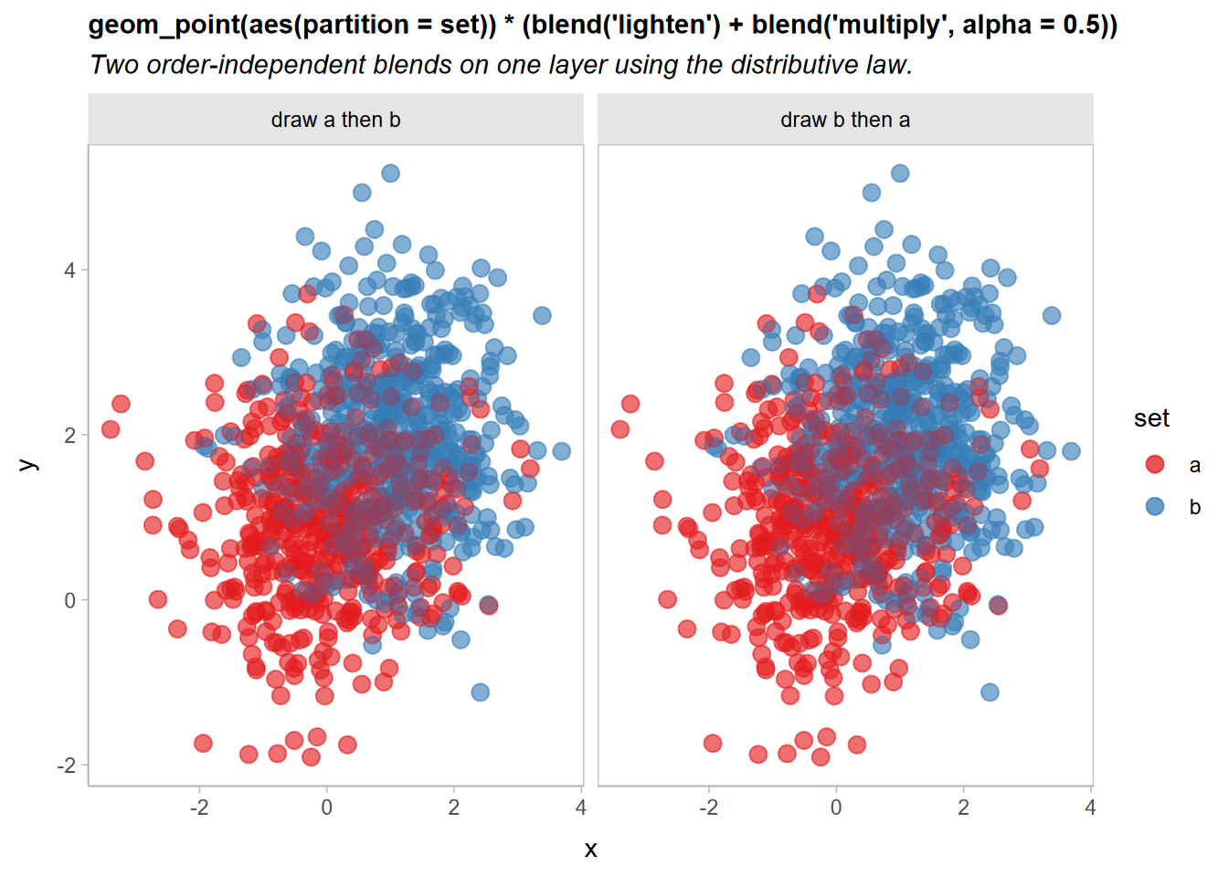 geom_point(size = 3, alpha = 0.5) |> partition(vars(set)) * blend("multiply", alpha = 0.5) +We can simplify this is two ways: first,