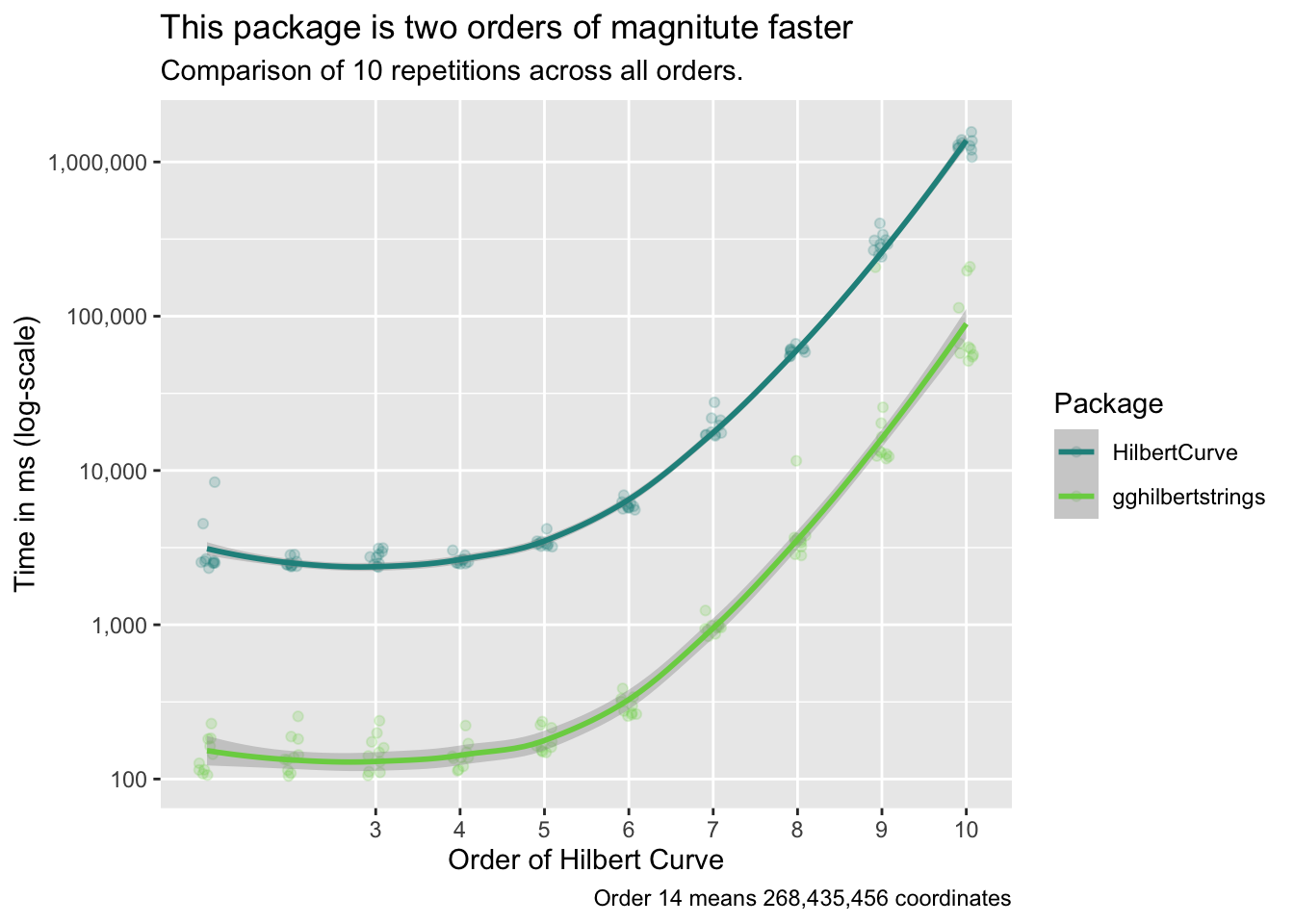 The gghilbertstrings package comes with functions for fast plotting of Hilbert curves in ggplot. At it’s core is a fast RCpp implementation that maps a 1D vector to a 2D position.
