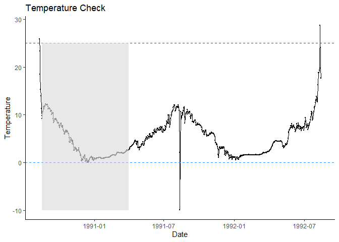 The example woody_island dataset is included in hatchR and contains temperature data from Woody Island, Lake Iliamna, Alaska. It includes daily water temperature data from 1990-1992. We can use plot_check_temp() to visually check the data. Spawning in this system typically peaks around August 18 and hatching and emergence are done before the start of the following spawning season, so we can predict phenology within a subset of a year. Because plot_check_temp() returns a ggplot2 object, we can add additional ggplot2 elements to customize the plots.