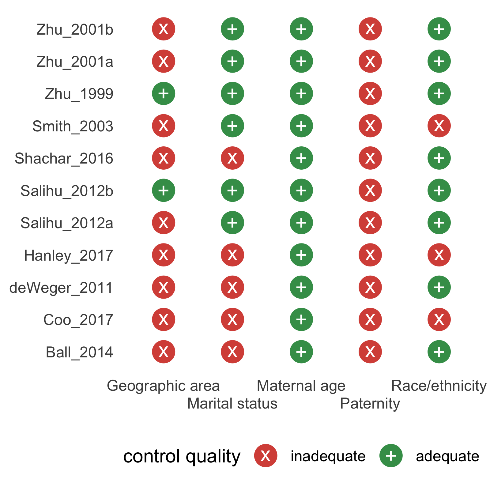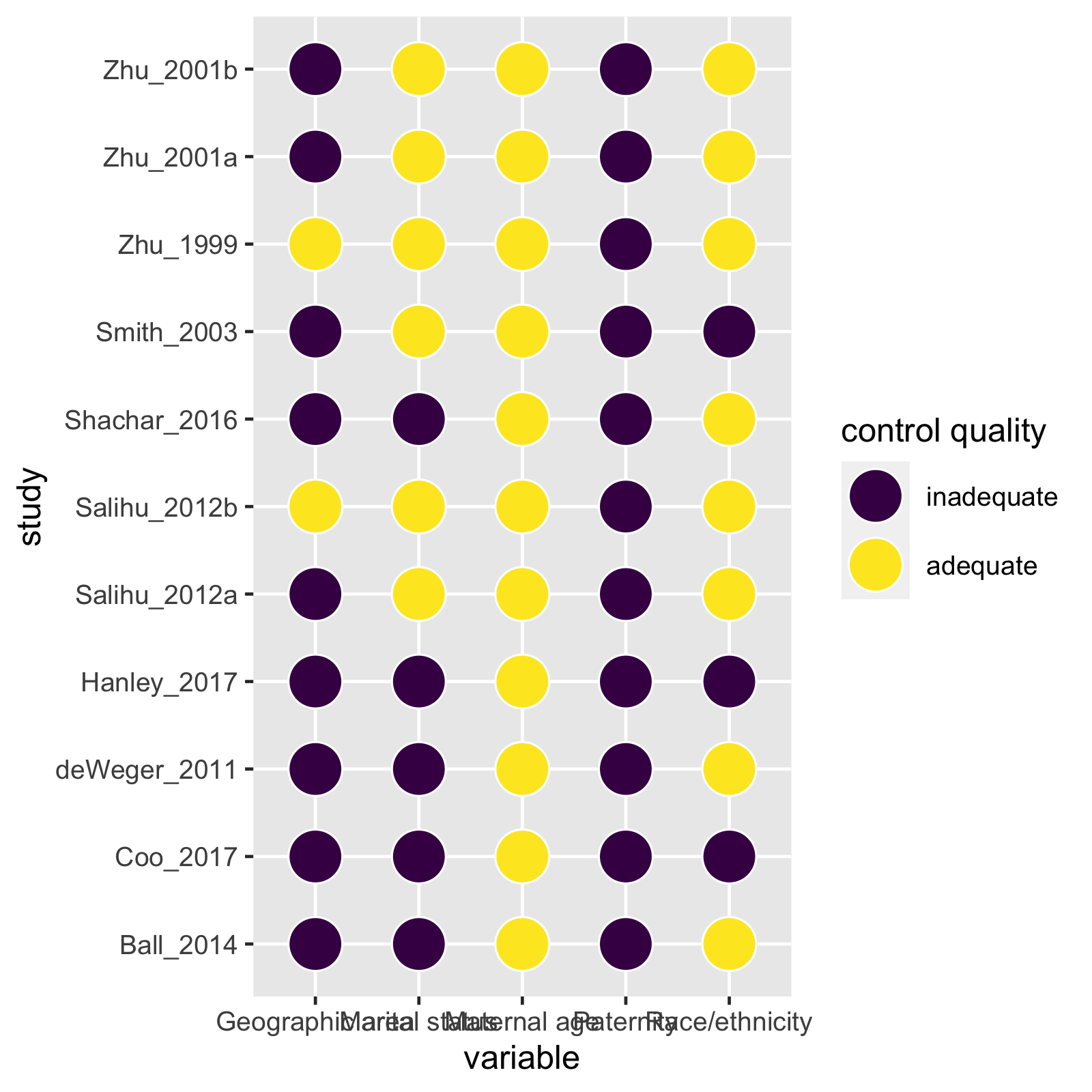 #> 1 Sociodemographics Maternal age Y Zhu_2001a adequate