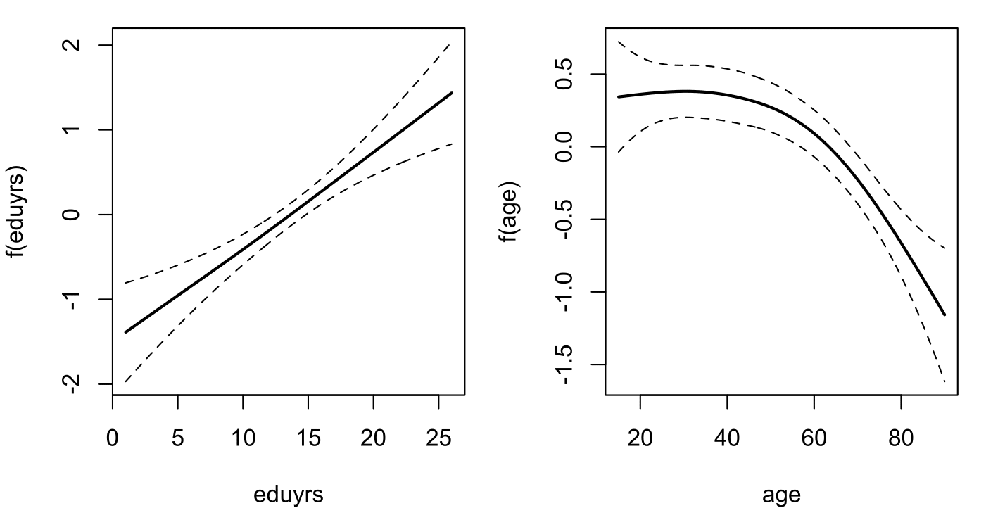 The estimated additive terms for education and age look a bit different from the estimates for Wallonia with, here, the suggestion of a statistically significant and linear effect of ‘eduyrs’.