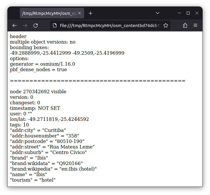 Finally, show_content() displays the content of an OSM file either in .html, .xml or .opl format. The function takes as input the path to the OSM file whose content should be shown, the output format in which the content should be displayed (defaulting to .html, the most human readable format, although also the slowest to open and inspect, depending on the size of the input file) and the type of objects that should be included in the output (defaulting to all existing objects in the input). The function returns the path to the temporary file in which the OSM file content was saved and opens the content in the web browser or the most appropriate application, depending on the output format.