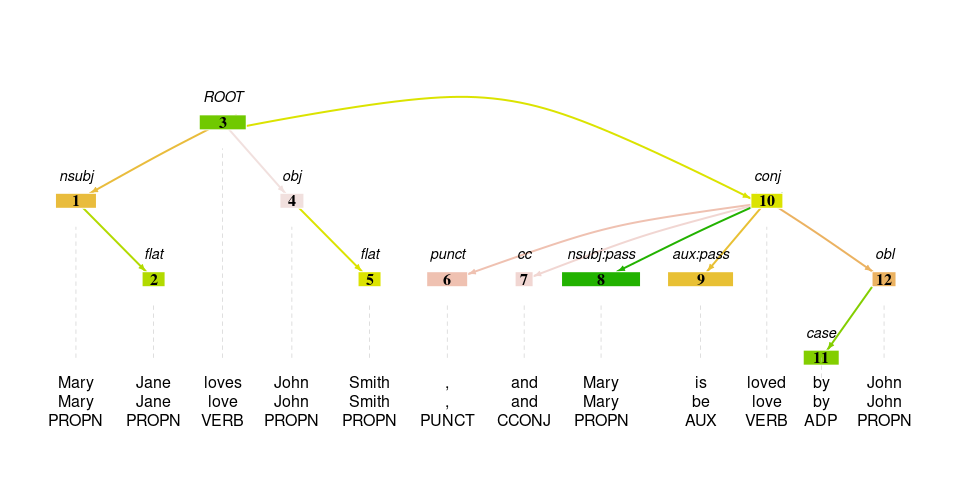 tokens = udpipe('Mary Jane loves John Smith, and Mary is loved by John', 'english')rsyntax requires the tokens to be in a certain format. The as_tokenindex() function converts a data.frame to this format. For popular parsers in R (spacyr and udpipe) the correct column name specifications are known, so the following is sufficient.