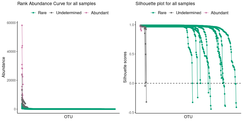 More specifically, the partitioning around medoids (k-medoids) algorithm is used to divide taxa within a sample into clusters. The clusters are then ordered based on a user-defined classification vector. By default, our method classifies all taxa in: “rare”, “undetermined” or “abundant”. In alternative, the user can change the number of classifications. To do so, ulrb includes functions to help the user decide the number of clusters (k), but it is also possible for ulrb to automatically decide the number of clusters (equivalent to the number of classifications). Besides clustering, ulrb includes functions to help evaluate the clustering quality (e.g. average Silhouette score).