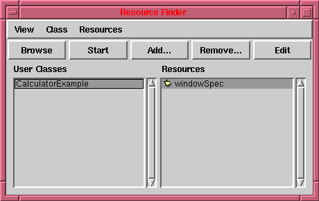 . Select View->User Classes from the Resource Finder menu. Select the class you would like to start. To start the Calculator Example that we previously filed in, select the CalculatorExample class and the windowSpec resource as depicted below. (Note that the windowSpec resource is automatically selected because it is the only resource for the CalculatorExample class.) Select Start from the Resource Finder and the Calculator Example will start. When you have finished using the Calculator, close the application by selecting close from the Calculator [Window] menu. Close the Resource Finder.