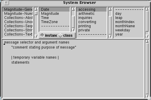 For example, select the category "Magnitude-General" and the classes associated with that category appear in the Class View. Select the Date class, and the protocols associated with that class are displayed in the Protocol View. Finally, select the accessing protocol and the methods associated with that protocol are displayed in the Method View. The System Browser should now look like the window shown below.