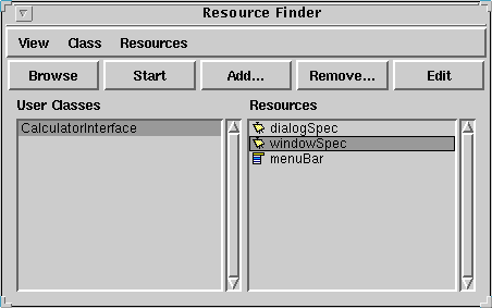 . Select View->User Classes from the Resource Finder Menu. Select the CalculatorInterface class and windowSpec resource on the Resource Finder, as shown in Figure 5.6.