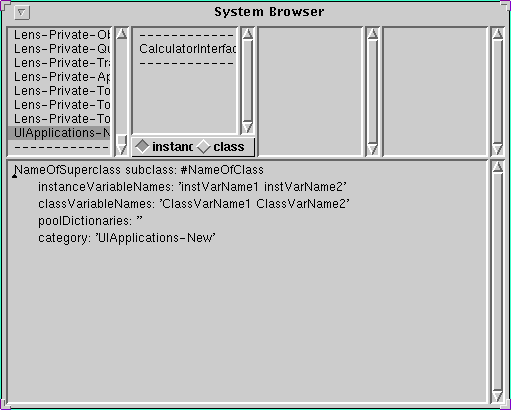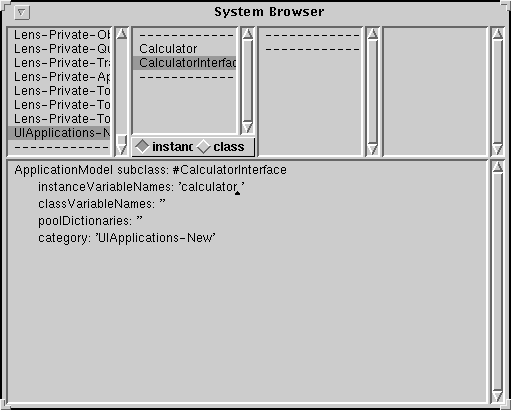 It is assumed that the state of the image is the same as it was at the end of Chapter 4. If you are restarting the tutorial, you will need to file in the CalculatorInterface class, begin with an image saved at the end of Chapter 4, or reconstruct the image. (It is not necessary to include the calculator application from file calc.st that was used in Chapter 2.)