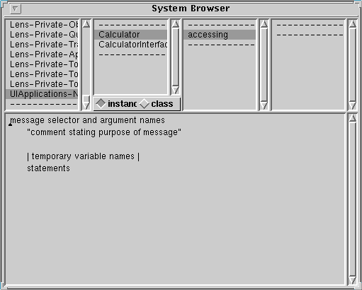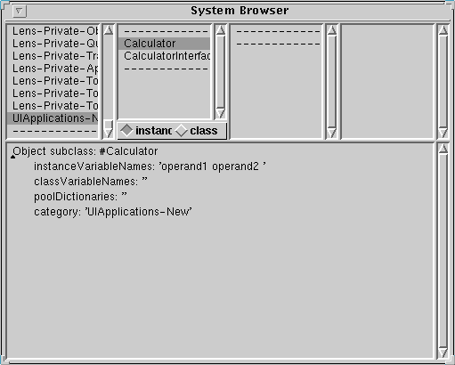 If a System Browser is not open, then open one now. Select the UIApplications-New category, the CalculatorInterface class, and the actions protocol. (If the browser was already open, you may need to deselect the CalculatorInterface class and reselect it to get the actions and aspects protocols.) There should be add, clear, and sub methods in the Method View. Select each of the methods add and sub, and replace its UIDefiner default method with its corresponding code listed below. Remember to choose accept from the Code View [Operate] menu after editing each method.
