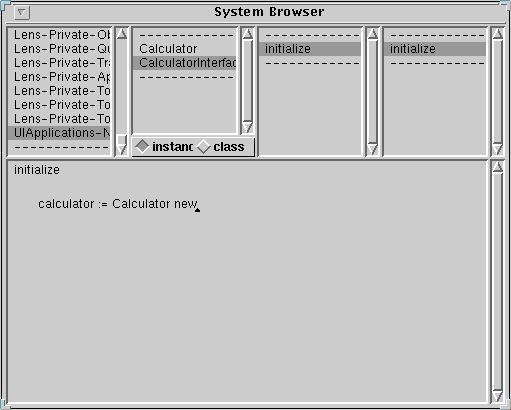 Make sure that the instance switch is on in the Class View and select add... from the Protocol View [Operate] menu. A dialog box will appear, enter "initialize" and click OK. Modify the method template to match the Code View in Figure 5.5. Choose accept from the Code View [Operate] menu. The System Browser should appear as in Figure 5.5.