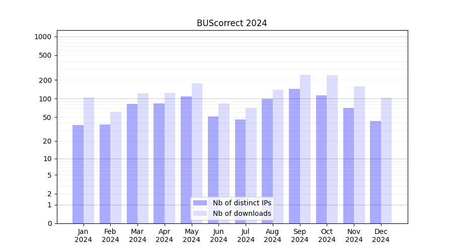 Number of downloads for software package BUScorrect, year by year, from 2025 back to 2014 (years with no downloads are omitted):