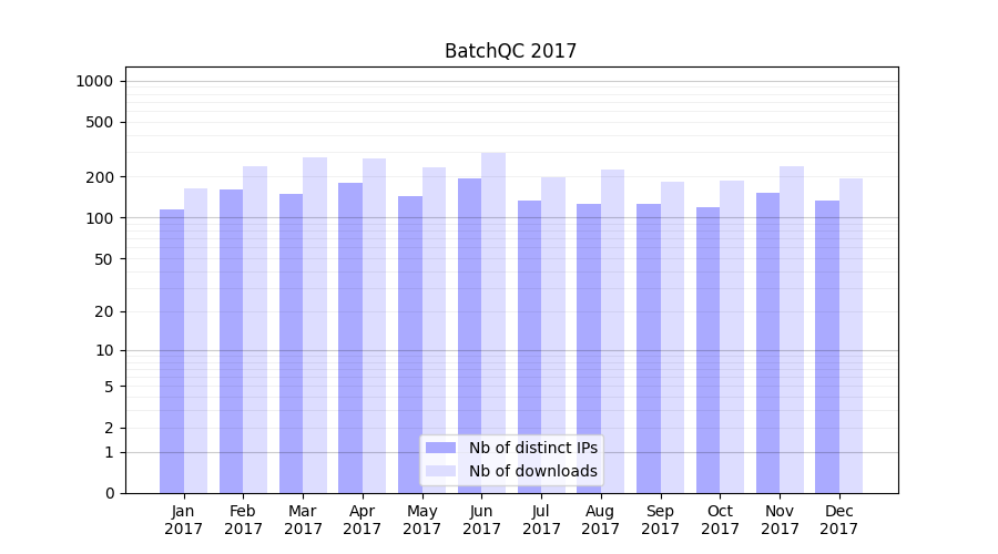 Number of downloads for software package BatchQC, year by year, from 2025 back to 2014 (years with no downloads are omitted):