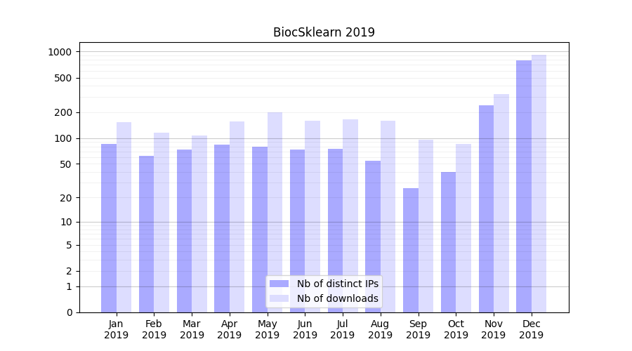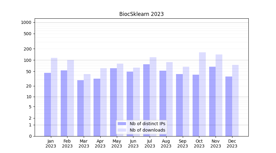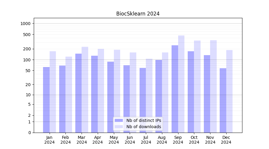 Number of downloads for software package BiocSklearn, year by year, from 2025 back to 2014 (years with no downloads are omitted):