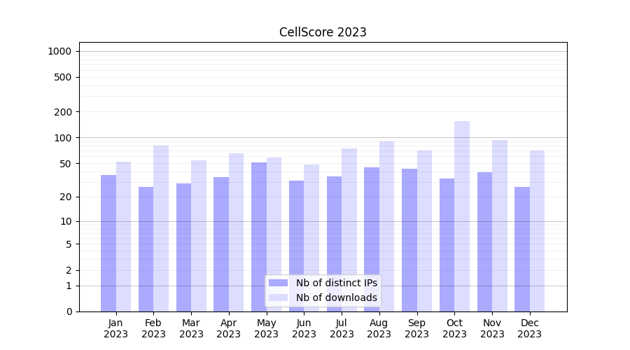 Number of downloads for software package CellScore, year by year, from 2025 back to 2014 (years with no downloads are omitted):