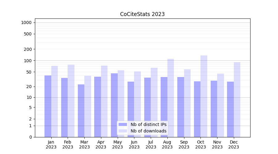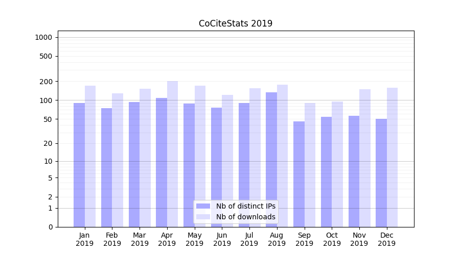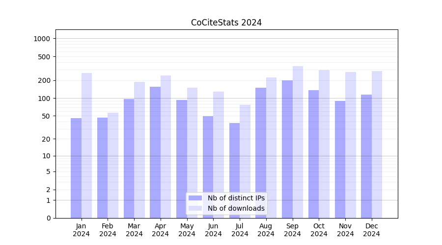 Number of downloads for software package CoCiteStats, year by year, from 2025 back to 2014 (years with no downloads are omitted):