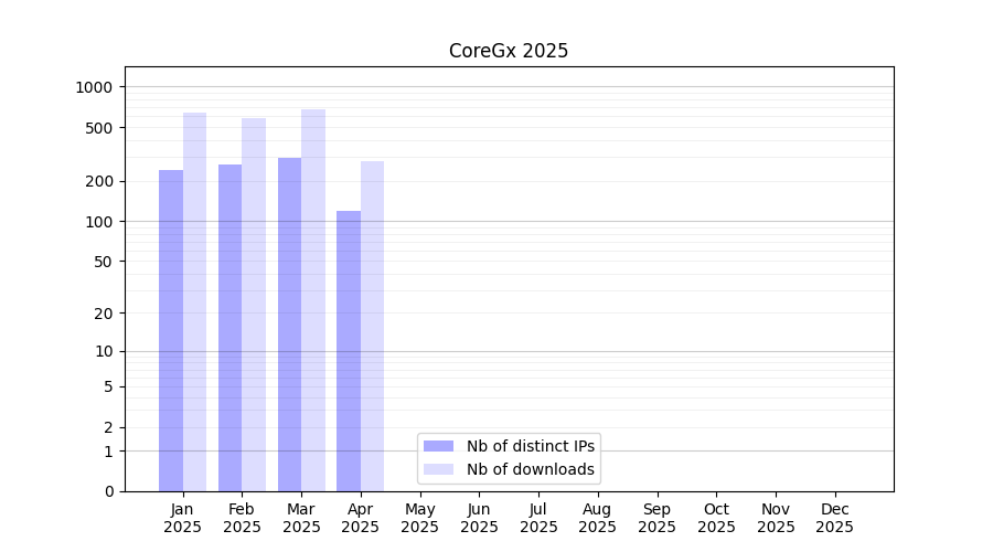 Number of downloads for software package CoreGx, year by year, from 2025 back to 2014 (years with no downloads are omitted):