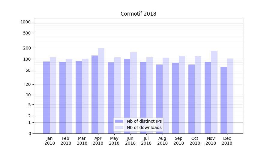 Number of downloads for software package Cormotif, year by year, from 2025 back to 2014 (years with no downloads are omitted):