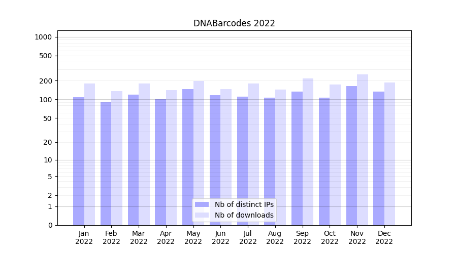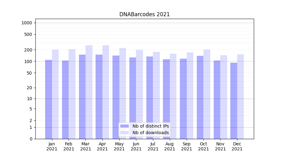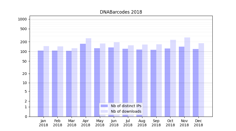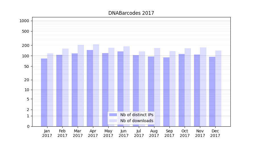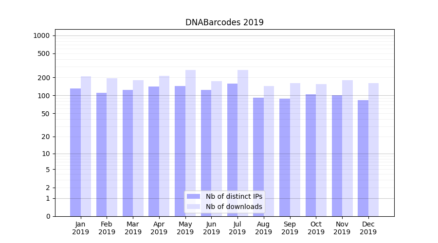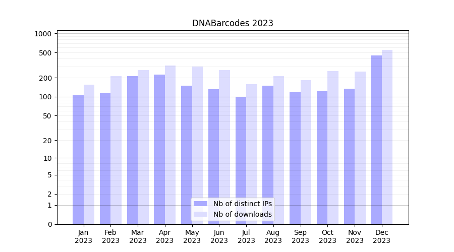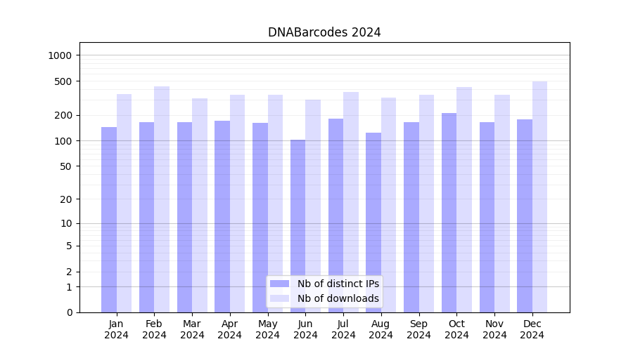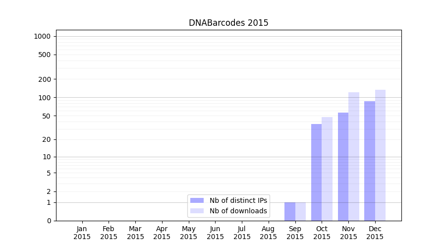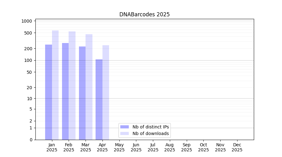 Number of downloads for software package DNABarcodes, year by year, from 2025 back to 2014 (years with no downloads are omitted):