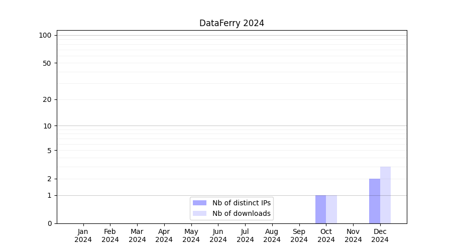 Number of downloads for software package DataFerry, year by year, from 2025 back to 2014 (years with no downloads are omitted):