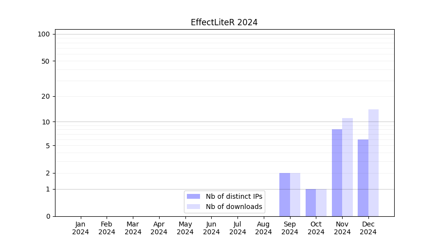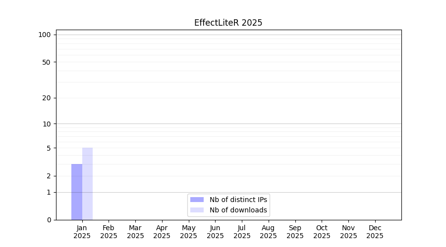Number of downloads for software package EffectLiteR, year by year, from 2025 back to 2014 (years with no downloads are omitted):