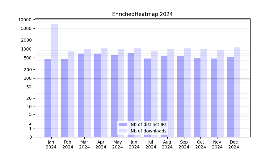 Number of downloads for software package EnrichedHeatmap, year by year, from 2025 back to 2014 (years with no downloads are omitted):