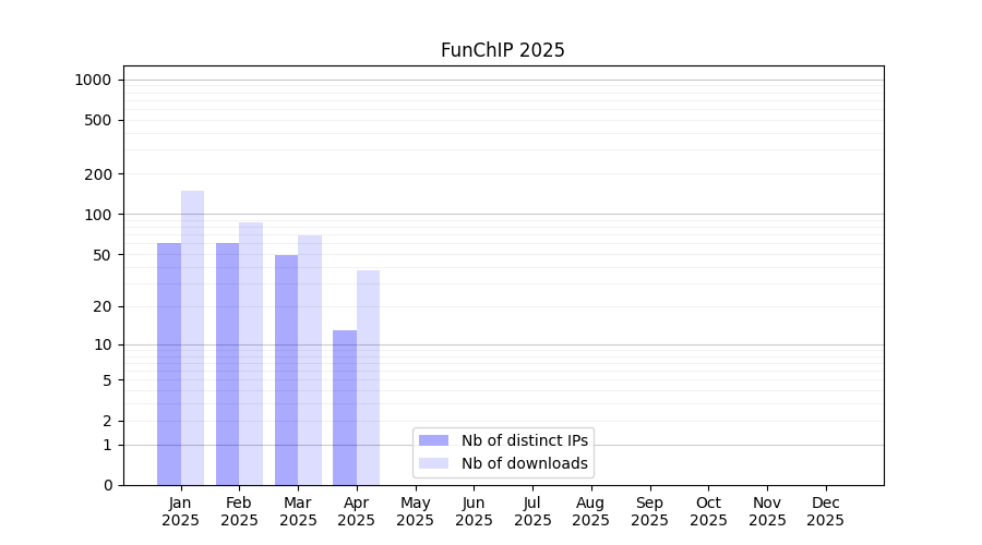 Number of downloads for software package FunChIP, year by year, from 2025 back to 2014 (years with no downloads are omitted):