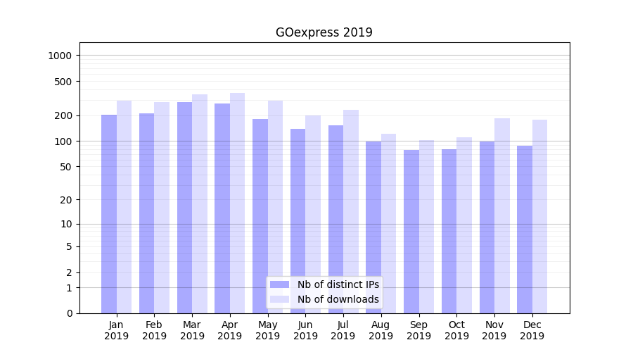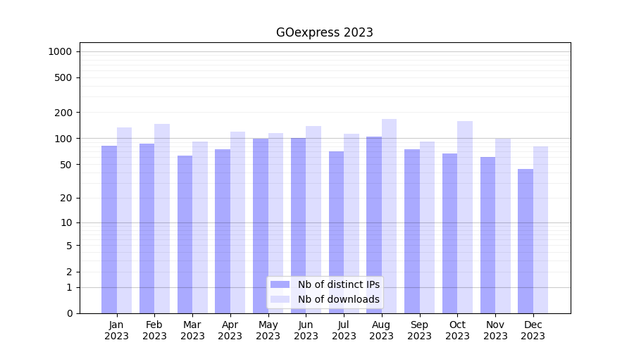 Number of downloads for software package GOexpress, year by year, from 2025 back to 2014 (years with no downloads are omitted):