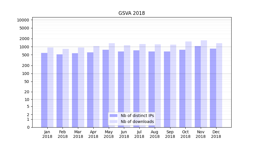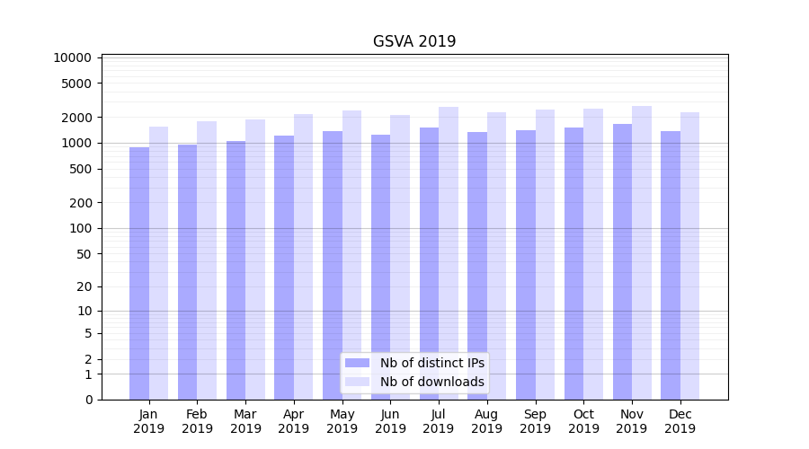 Number of downloads for software package GSVA, year by year, from 2025 back to 2014 (years with no downloads are omitted):