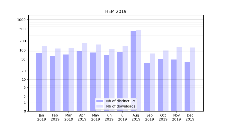 Number of downloads for software package HEM, year by year, from 2025 back to 2014 (years with no downloads are omitted):