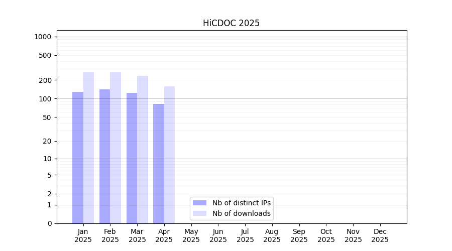 Number of downloads for software package HiCDOC, year by year, from 2025 back to 2014 (years with no downloads are omitted):