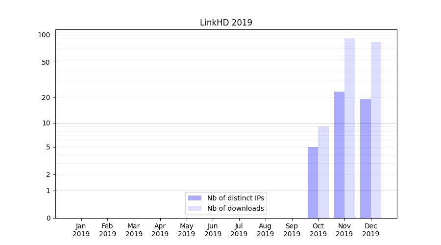 Number of downloads for software package LinkHD, year by year, from 2025 back to 2014 (years with no downloads are omitted):