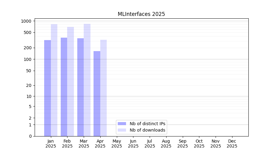 Number of downloads for software package MLInterfaces, year by year, from 2025 back to 2014 (years with no downloads are omitted):