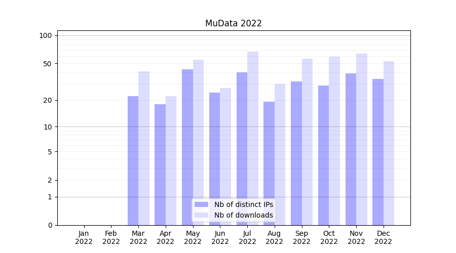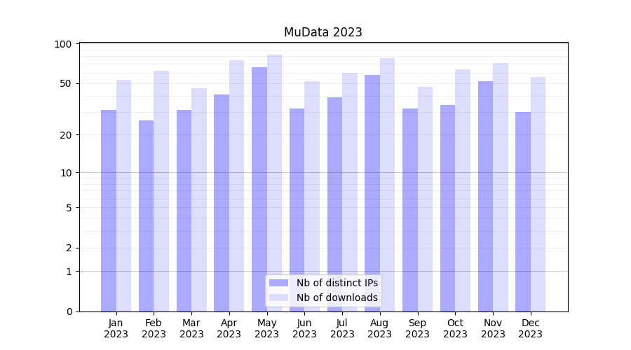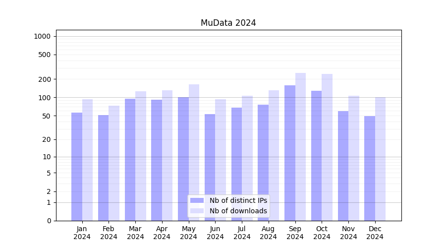 Number of downloads for software package MuData, year by year, from 2025 back to 2014 (years with no downloads are omitted):