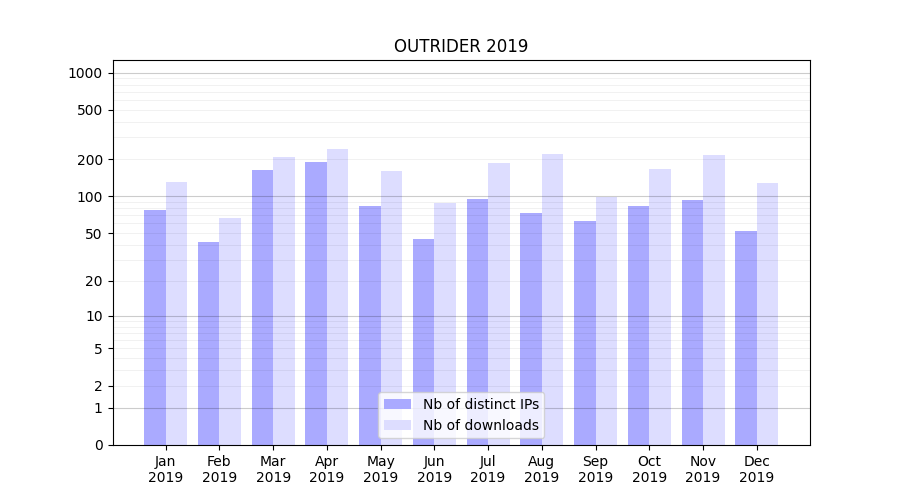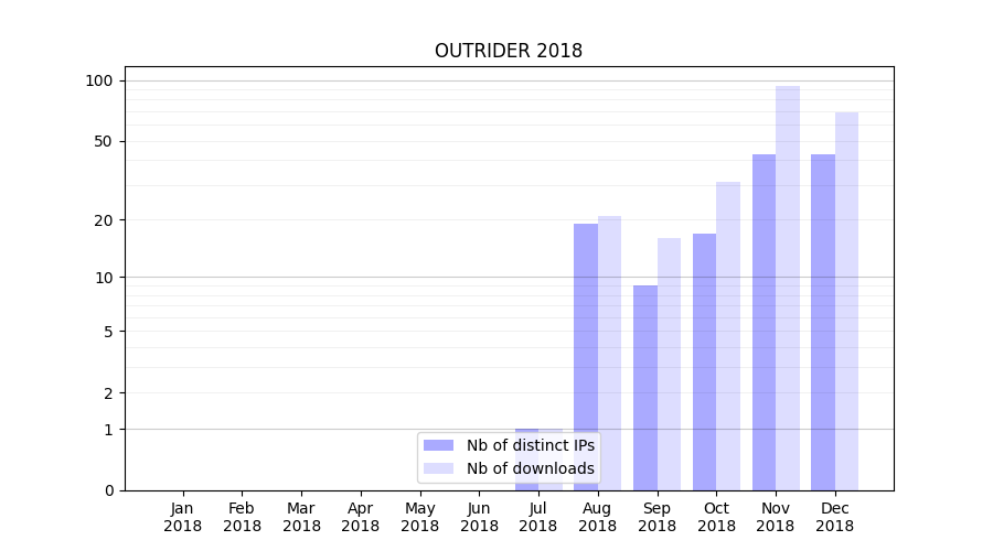 Number of downloads for software package OUTRIDER, year by year, from 2025 back to 2014 (years with no downloads are omitted):