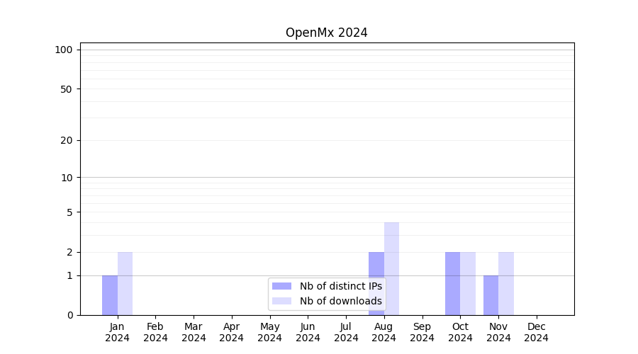 Number of downloads for software package OpenMx, year by year, from 2025 back to 2014 (years with no downloads are omitted):