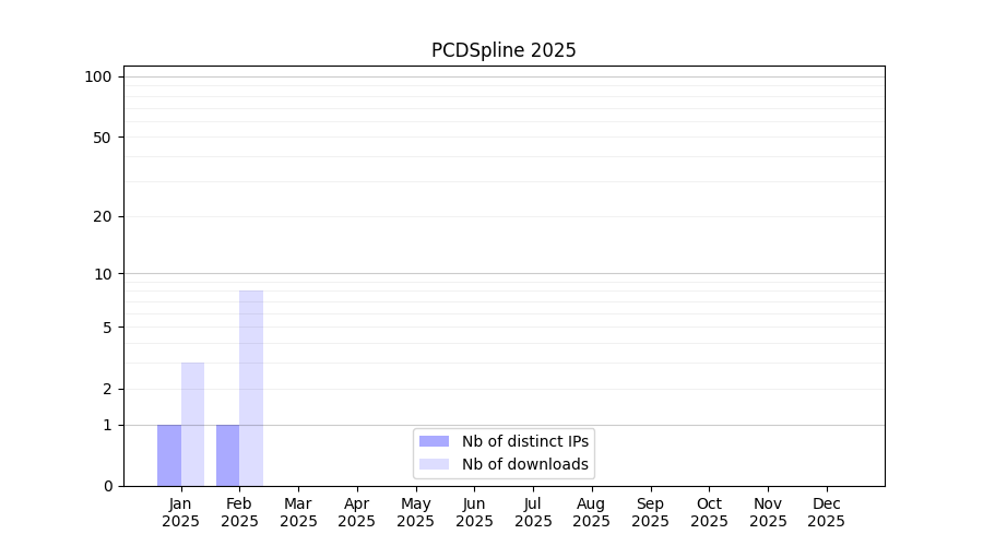 Number of downloads for software package PCDSpline, year by year, from 2025 back to 2014 (years with no downloads are omitted):
