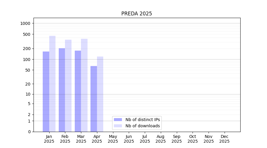 Number of downloads for software package PREDA, year by year, from 2025 back to 2014 (years with no downloads are omitted):